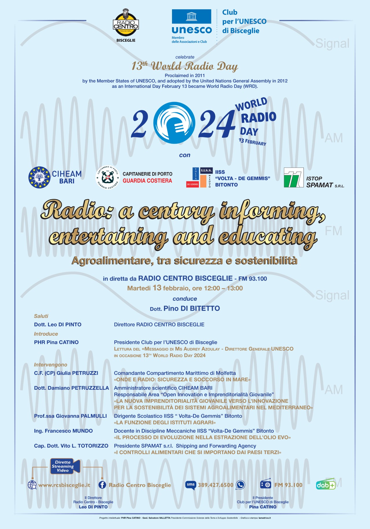 Il tema della Giornata Mondiale della Radio nel 2024 è “Radio: un secolo che informa, diverte ed educa” è celebrato dal Club per l’UNESCO di Bisceglie e Radio Centro Bisceglie (in diretta FM 93.100, dab+, in diretta Streaming video www.rcsbisceglie.it e su facebook pagina Radio Centro) insieme a Capitanerie di Porto – Guardia Costiera, Ciheam Bari (Centre international de hautes études agronomiques méditerranéennes), IISS “Volta – De Gemmis” Bitonto e SPAMAT s.r.l. Shipping and Forwarding Agency.