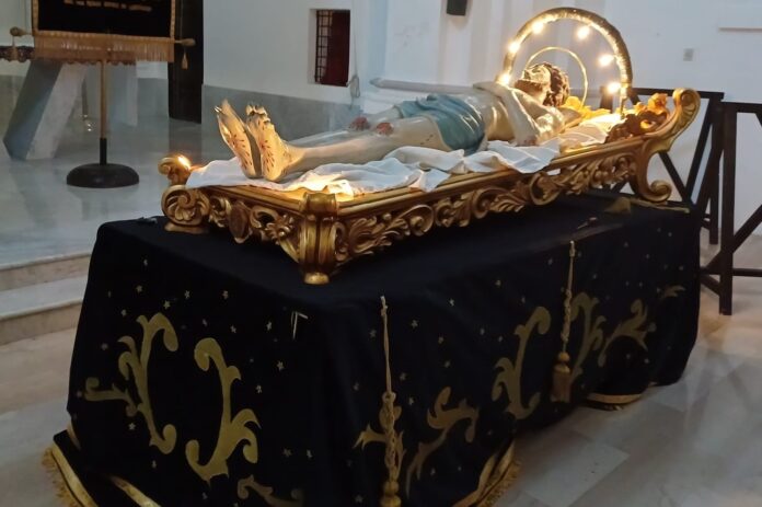 “Ringrazio, intanto, il Priore Sabella per le belle parole usate nei miei confronti – dice il Prof. Paolo Ricchiuti -. Quando sono venuto per la prima volta a Lanciano, guardando il simulacro del Cristo mi sono subito reso conto dell’importanza che ha per la città e la confraternita. Il lavoro si è svolto in cinque mesi e siamo partiti dagli studi sui vari stilemi delle portantine processionali che generalmente si usano. Ma la necessità era far emergere l’immagine del Cristo alla pietà popolare. Ho alleggerito di molto la sagoma e la forma della lettiga creando una cornice di foglie d’acanto che reggessero il Cristo quasi a renderlo il più leggero possibile, sia nella forma che nella composizione. E’ un’immagine molto preziosa che, a differenza di molte altre figure del Cristo Morto del ‘700, rappresenta una postura molto pacata che mi ricorda l’immagine del “Cristo in scorcio” di Mantegna. Quando la confraternita ha commissionato il lavoro, mi sono sentito onorato dell’incarico ricevuto fuori dai miei confini regionali. Come spesso faccio, mi sono impegnato con tutto il cuore e ricordo di aver profuso tale impegno quando ho realizzato il Pastorale per Papa Francesco, consapevole di andare di fronte a Sua Santità.  La stessa sensazione la sto provando in questa circostanza, perché lasciare un mio lavoro, una mia testimonianza, da biscegliese, da pugliese, in una terra nuova com’è l’Abruzzo per me, è molto importante”.