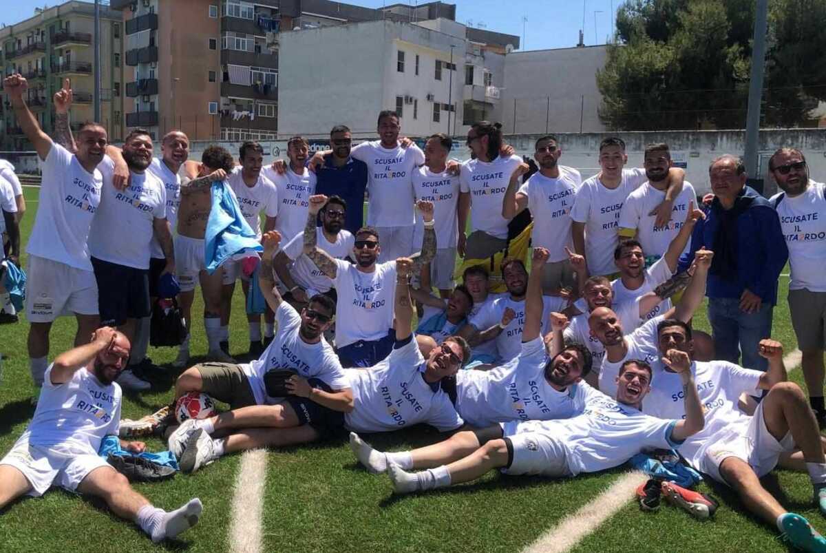 “Scusate il rita2rdo”. È la frase che campeggia sulla t-shirt celebrativa realizzata dalla dirigenza della Eagles Bisceglie per festeggiare l’agognato traguardo della promozione. Con la cifra “2” in bella evidenza a richiamare, appunto, il salto in Seconda Categoria: merito della vittoria di misura conseguita dai ragazzi di mister Claudio Lopopolo nella finale playoff disputata sul sintetico del “Di Liddo” a spese della New Carpediem Barletta.