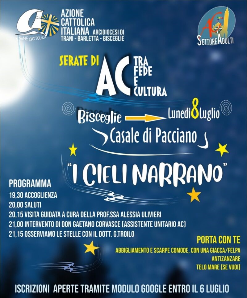 Il secondo appuntamento delle Serate di fede e cultura, promosse dal Settore Adulti dell’Azione Cattolica diocesana, si svolgerà lunedì 8 luglio, alle 19.30, a Bisceglie, presso il Casale di Pacciano.