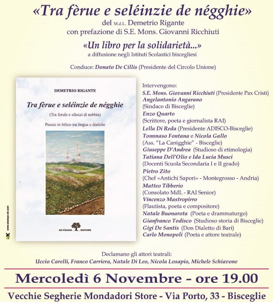 Mercoledì 6 novembre 2024 alle ore 19.00 presso le Vecchie Segherie Mondadori Store/Mastrototaro food, Via Porto 33, tel.080 809 1021 [email protected], si terrà la presentazione dal libro “Tra fèrue e seléinzie de négghie” del MdL Demetrio Rigante (ed. De Feudis) con prefazione del S.E. Mons. Giovanni Ricchiuti. Una Serata anche all’insegna della Solidarietà in quanto, su iniziativa sostenuta dallo stesso Autore, le copie del libro saranno messe a disposizione per una raccolta fondi a favore dell’ADISCO – Associazione Donatrici Italiane Sangue Cordone Ombelicale.