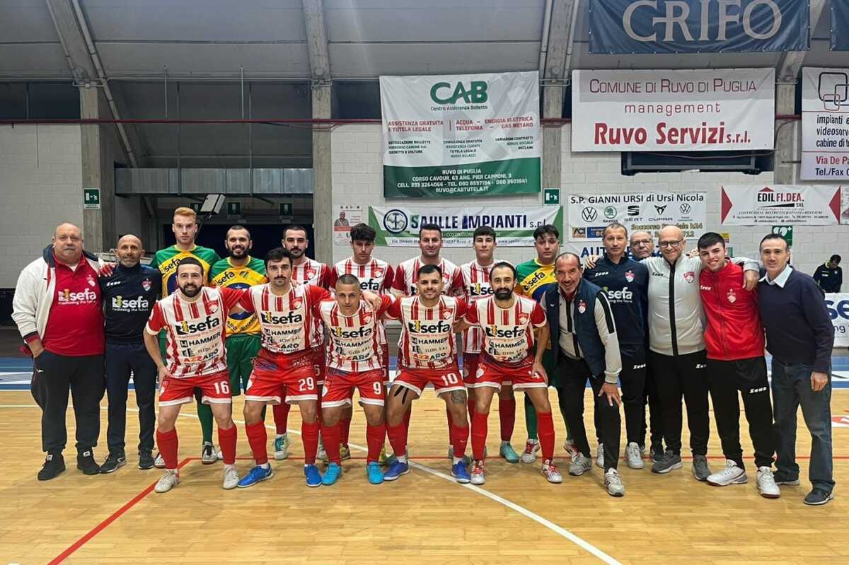 I biancorossi hanno dominato il match fin dalle battute iniziali andando a bersaglio ben 5 volte con il mattatore Sergio De Cillis, accompagnato nel tabellino dei marcatori da Silvio Dell’Olio, Roberto Sasso e Domenico Binetti, autori di un gol a testa. Tra i protagonisti della sfida anche l’estremo difensore Di Ciaulo con diversi interventi strappa-applausi.