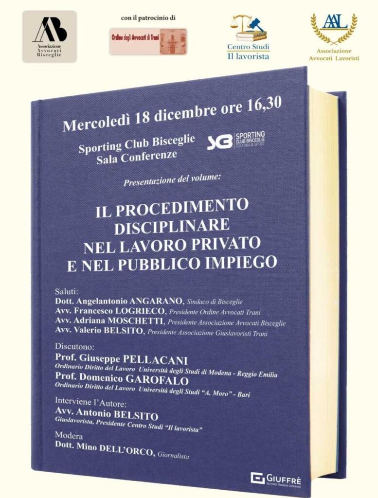 Si terrà presso lo Sporting Club di Bisceglie mercoledì 18 dicembre alle ore 16.30, la presentazione del volume “Il procedimento disciplinare nel lavoro privato e nel pubblico impiego” di Antonio Belsito, edito da Giuffrè.
