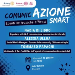 Il Rotary Club e il Rotaract Club di Bisceglie organizzano “ComunicAZIONE Smart: Spunti su tecniche efficaci”, un evento formativo dedicato alle strategie di comunicazione, che si terrà mercoledì 15 gennaio 2025, alle ore 20:00 presso l’Hotel Salsello di Bisceglie.