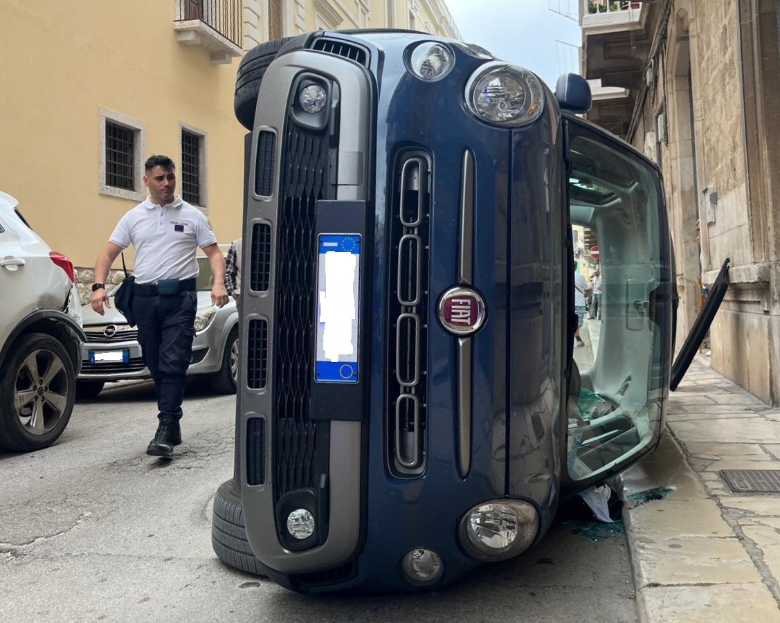 Intorno alle 11.00 una Fiat 500 L, con a bordo un uomo di 56 anni originario di Molfetta, ma residente a Bisceglie, ha perso improvvisamente il controllo della voluminosa vettura, che ha colpito dapprima altre due auto parcheggiate in sosta sulla propria destra, quindi si è ribaltata a ridosso del marciapiede opposto.