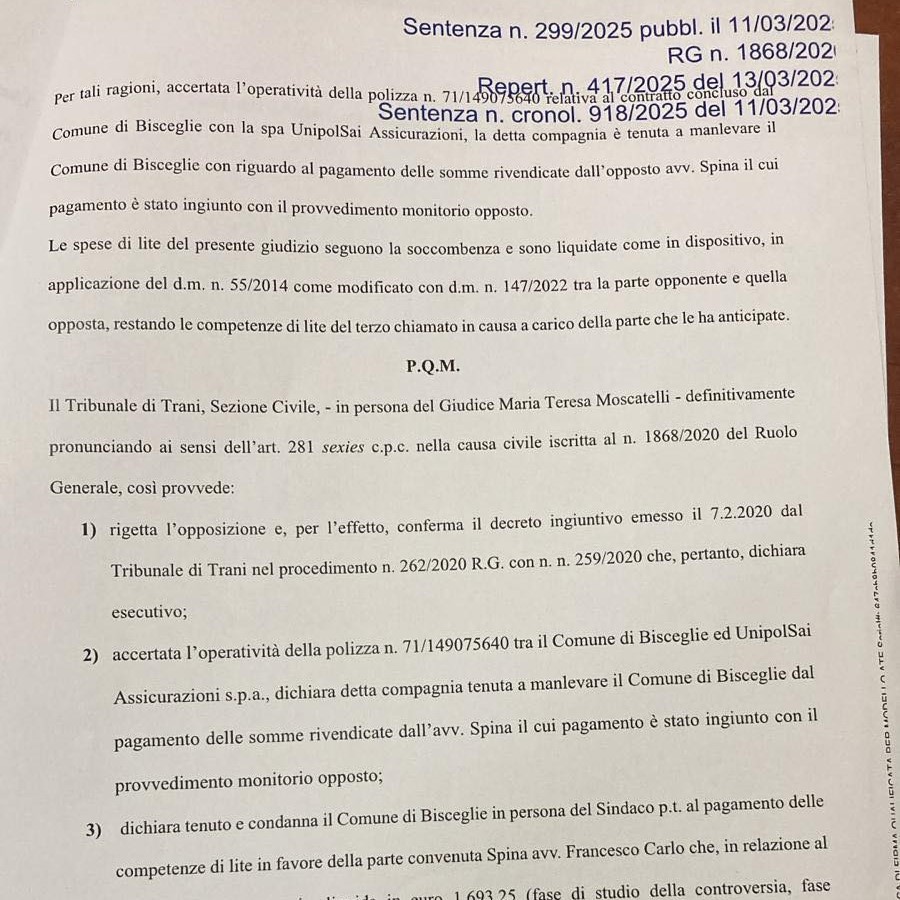 «Con sentenza n. 299 del 2025, il Comune di Bisceglie è stato condannato nei miei confronti, per l’ennesima volta (ci sono state in precedenza almeno altre dieci sentenze di condanna, che hanno visto soccombente il Comune sempre nei miei confronti) a indennizzare le spese legali da me sostenute quando ero sindaco, per esercitare il mio diritto di difesa a norma dell’art. 86 del testo unico degli enti locali, con provvedimento di condanna anche al pagamento delle spese di giudizio – aggiunge l’esponente di Azione – . Il mio rammarico non è tanto per la resistenza temeraria del Comune avverso i miei sacrosanti diritti (non sono stato mai “tentato” di lamentarmi di fronte a vessazioni o ingiustizie, ma ho sempre preferito difendermi nelle sedi opportune come mi ha insegnato l’esercizio della mia professione di avvocato) sempre rispettati in passato dalle precedenti amministrazioni nelle medesime situazioni, ma la circostanza che in tal modo si stanno dissipando, con giudizi assolutamente inutili e pretestuosi (addirittura opposizioni a decreti ingiuntivi, opposizioni all’esecuzione avverso sentenze esecutive o “resistenze” nei giudizi di ottemperanza avverso sentenze passate in giudicato), risorse pubbliche che si sarebbero potute spendere in favore dei cittadini, abbassando tasse, tariffe o erogando servizi verso le fasce sociali più fragili. Il consiglio comunale di oggi 23 luglio riguarda altri casi simili al mio, che hanno causato ulteriori debiti fuori bilancio all’ente comunale ed evidenti danni erariali con resistenze inutili verso altri cittadini forse “antipatici” (?) a questa amministrazione, così come è avvenuto contro di me. Il 2024, con i debiti fuori bilancio all’ordine del giorno del consiglio del 23 luglio, registra ormai il record storico biscegliese e il record pugliese di debiti fuori bilancio: ci avviamo verso l’ufficializzazione di 10 milioni di euro riconducibili e emersi nel 2024, ma “spalmati” con artifici giuridici e amministrativi anche nell’anno 2025, “falsando” così il bilancio consuntivo del 2024 in modo evidente e incontestabile. Di fronte a tale illegalità contabile chi non vorrà intervenire per accertare le varie responsabilità erariali potrà solo mettere la testa sotto la sabbia come fanno gli struzzi», conclude Spina.